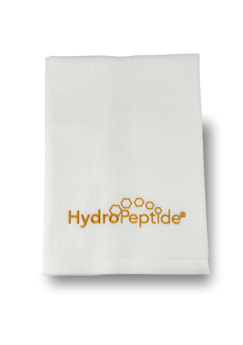 40x60 cm Kleines Baumwollhandtuch mit HydroPeptide-Logo, weiß mit goldener Stickerei